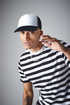 Padded front panel and peak Retro-style snapback size adjuster Perfect for print and embroidery Fabric100% Polyester front panel. 100% Polyester mesh rear panels